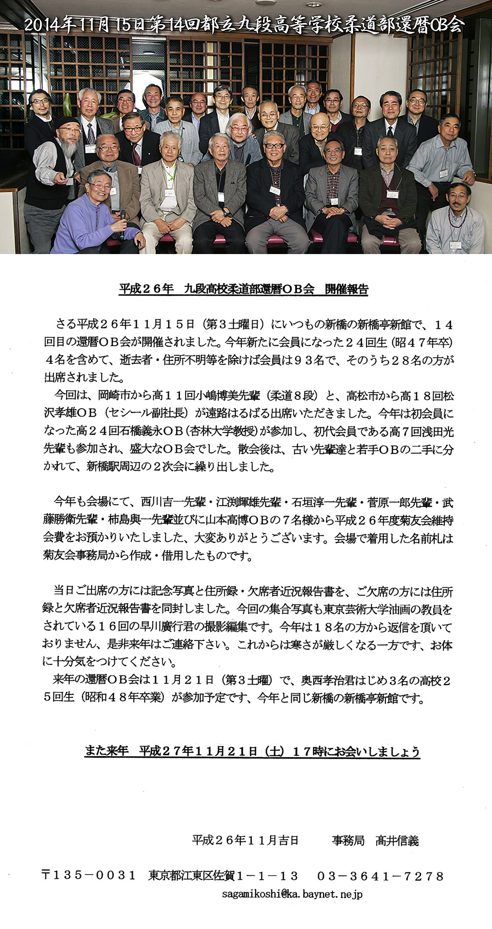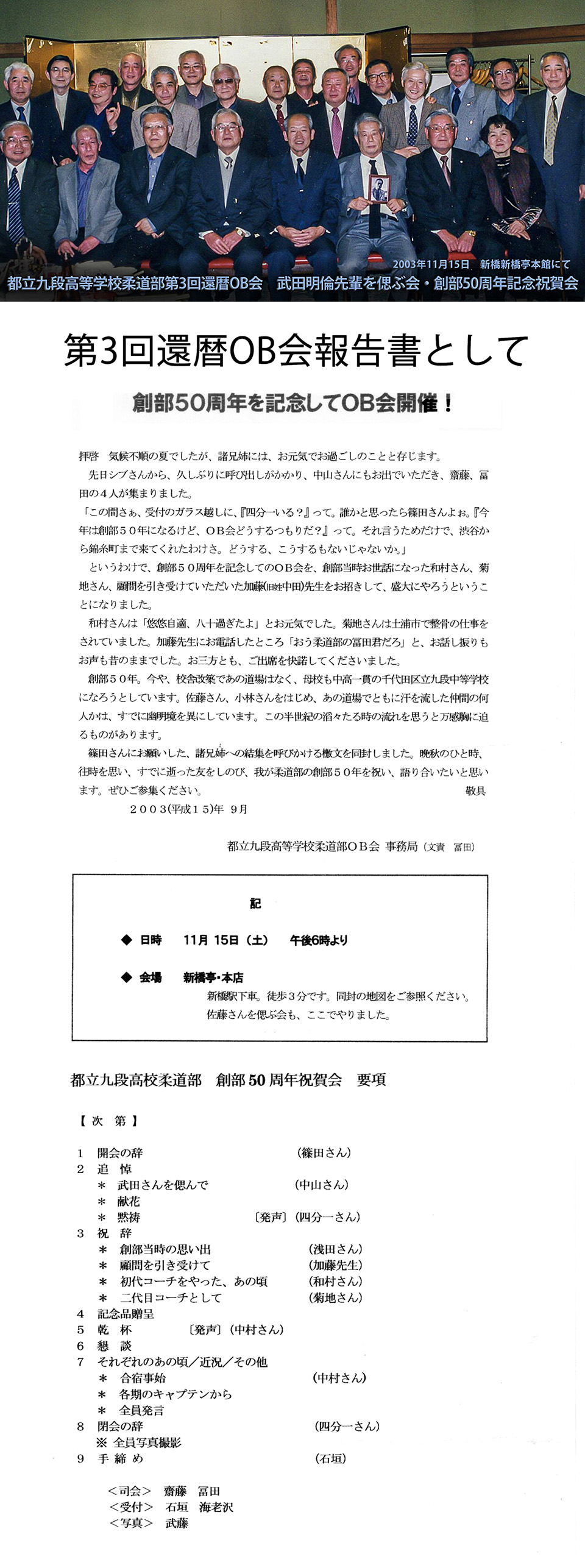 | 九段高校柔道部からのお知らせを有難うございます。懐かしく拝見しました。在学中に、堀田先 |